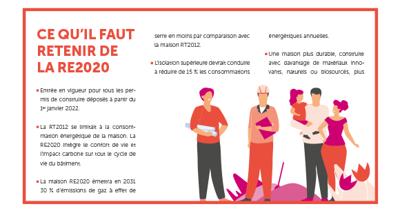 Dans la continuité de la RT2012, la RE2020 vise à diminuer de 30 à 40 % la consommation énergétique globale des maisons en comparaison avec la RT2012. L’isolation de votre maison est renforcée pour diminuer les besoins en chaud et en froid. Une meilleure isolation, plus de confort, moins de consommation !
